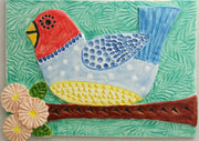 This handcrafted ceramic wall art tile measures approximately 7inches x 6 inches x 3/4 inch.  All of White Clover Kilns wall art tiles are created from slabs of clay that are cut, layered, textured and glazed, and fired in our studio .  Mary creates each piece by hand without the use of molds making each piece a unique, one of a kind artwork.  The tiles come with an embedded wire loop in the back for hanging.  If you would like your tile to be grouted onto a wall please inform us at the time of ordering so that we do not include this loop when creating your piece.