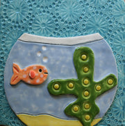 This handcrafted ceramic wall art tile measures approximately 7inches x 6 inches x 3/4 inch.  All of White Clover Kilns wall art tiles are created from slabs of clay that are cut, layered, textured and glazed, and fired in our studio .  Mary creates each piece by hand without the use of molds making each piece a unique, one of a kind artwork.  The tiles come with an embedded wire loop in the back for hanging.  If you would like your tile to be grouted onto a wall please inform us at the time of ordering so that we do not include this loop when creating your piece.