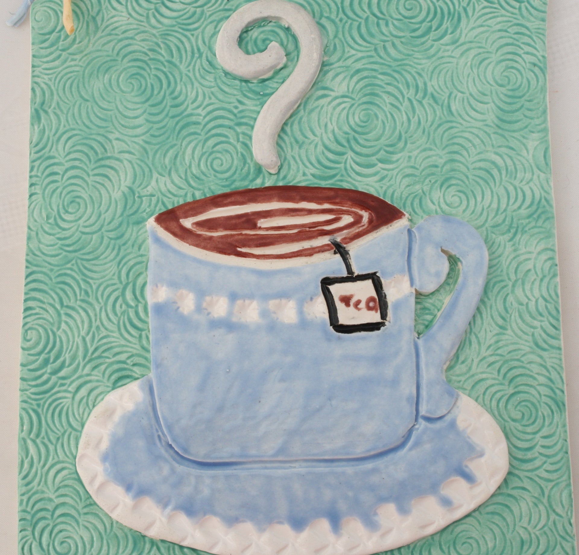This handcrafted ceramic wall art tile measures approximately 7inches x 6 inches x 3/4 inch.  All of White Clover Kilns wall art tiles are created from slabs of clay that are cut, layered, textured and glazed, and fired in our studio .  Mary creates each piece by hand without the use of molds making each piece a unique, one of a kind artwork.  The tiles come with an embedded wire loop in the back for hanging.  If you would like your tile to be grouted onto a wall please inform us at the time of ordering so that we do not include this loop when creating your piece.