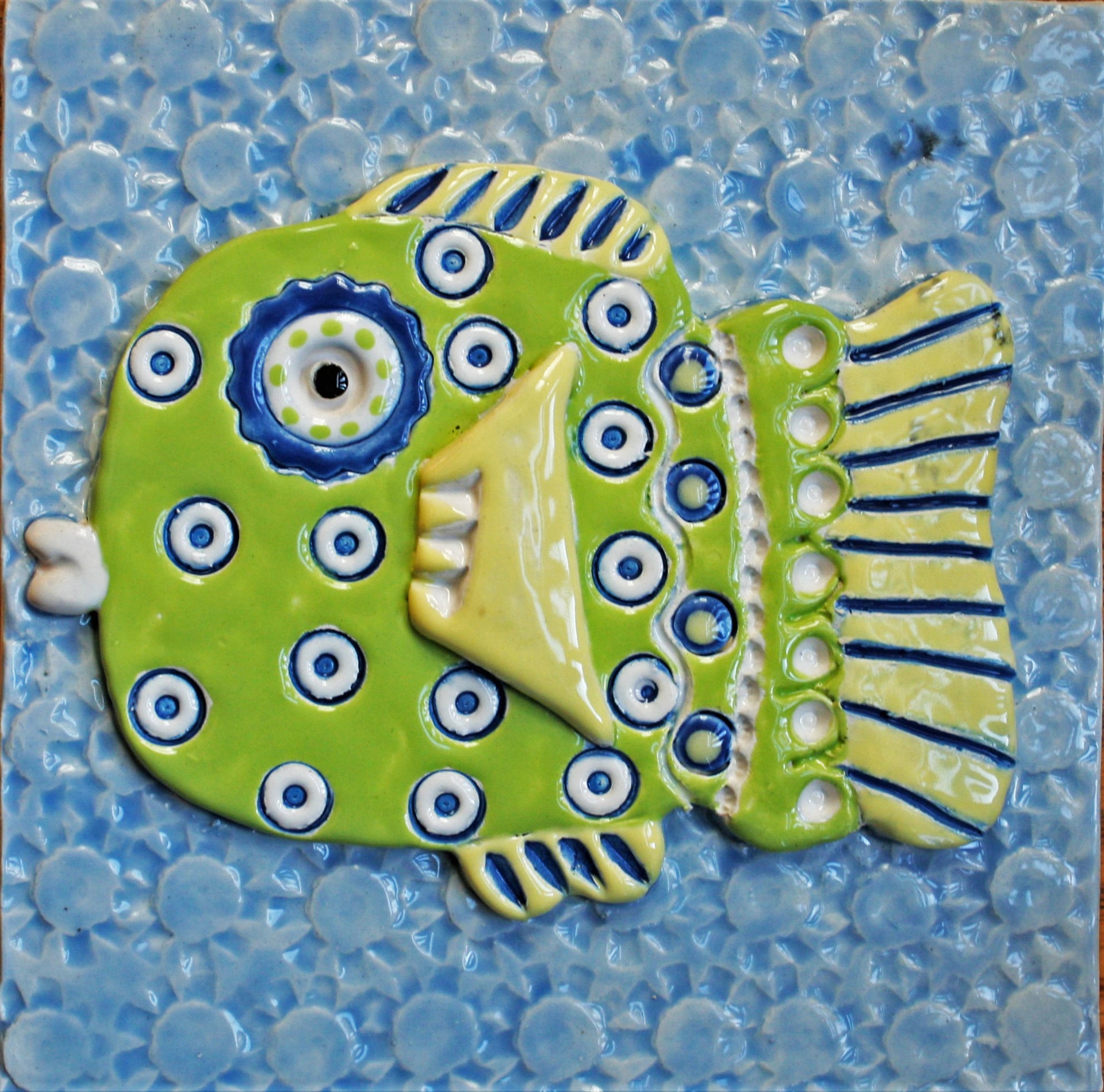 This handcrafted ceramic wall art tile measures approximately 7inches x 6 inches x 3/4 inch.  All of White Clover Kilns wall art tiles are created from slabs of clay that are cut, layered, textured and glazed, and fired in our studio .  Mary creates each piece by hand without the use of molds making each piece a unique, one of a kind artwork.  The tiles come with an embedded wire loop in the back for hanging.  If you would like your tile to be grouted onto a wall please inform us at the time of ordering so that we do not include this loop when creating your piece.